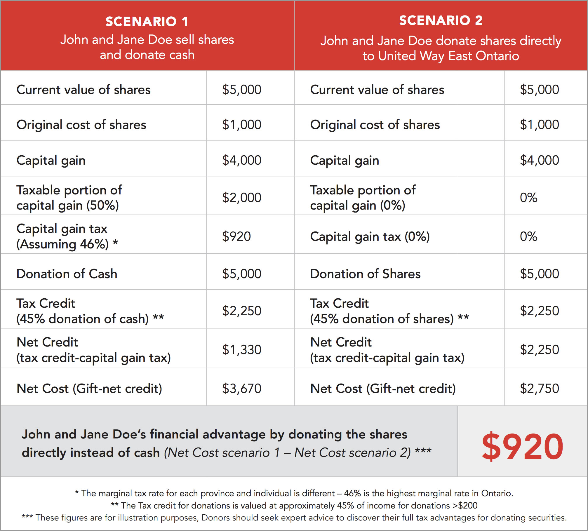 « Les dons de titres cotés en bourse et à valeur accrue sont, de façon générale, plus avantageux sur le plan fiscal que les dons en espèce. Les gains en capital découlant de la valeur accrue remis à un organisme de bienfaisance, comme à Centraide de l’Est de l’Ontario, sont éliminés et vous recevrez un reçu officiel pour la juste valeur marchande des titres versés. En général, 50 % des gains en capital sont considérés comme un revenu imposable.