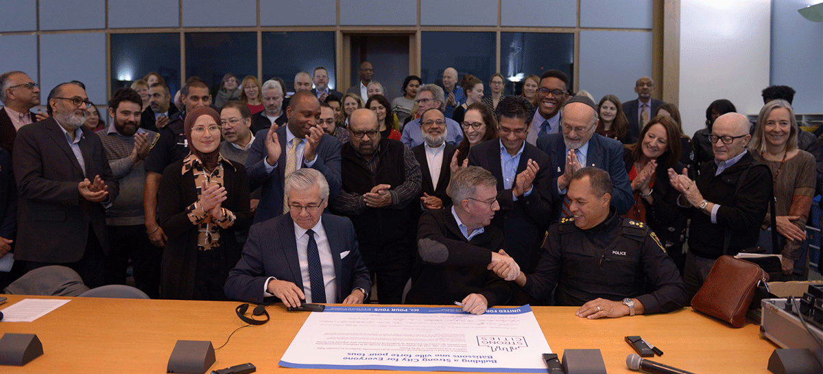 Tout d’abord, le maire Jim Watson et la direction de la ville d’Ottawa signeront l’entente du Strong Cities Network (SCN), faisant de cette coalition la plus grande à se joindre au mouvement. Mis en place en septembre 2015, le SCN comprend plus de 120 villes. Il établit des collaborations entre les maires, les groupes politiques et les organismes de première ligne, et ce, pour mettre fin à la polarisation, à la haine et à la violence dans les communautés locales de ce monde. À titre de membres, la ville et la coalition Ici, pour tous pourront accéder aux données de recherche, aux services de soutien liés au renforcement des capacités et aux ressources en matière d’apprentissage, ainsi qu’à un centre de formation.
