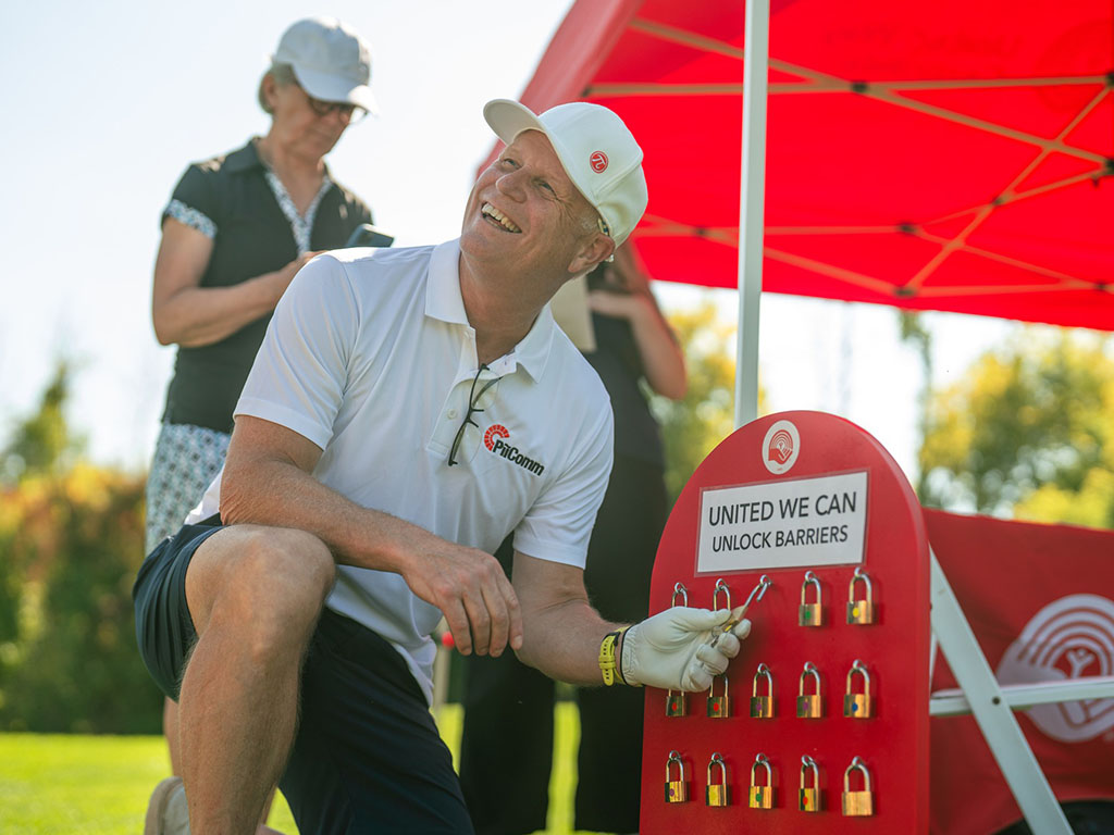 Quelle belle journée, remplie de plaisir! Les personnes présentes ont déverrouillé des cadenas pour symboliser les obstacles qu’elles aident à affronter d’un bout à l’autre de notre région. PiiComm a même invité un golfeur professionnel qui a mis les personnes présentes au défi de le battre en terminant en moins de coups que lui! Ce fut une journée fore-midable, du disque-golf aux trous d’un coup, en passant par le jeu-questionnaire, les mini cocktails et les boissons livrées par drone!